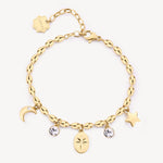 316L stainless steel bracelet, 14K gold pvd coating and pendants with moon, star and clear crystals.