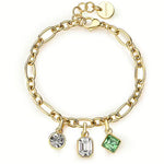 Brosway Women's Bracelet 316 Steel Gold Plated with Crystals. Women's bracelet made of 316 Steel with 14kt Gold finish, length 18 cm with two white Crystals and a green Crystal. Lobster clasp closure.