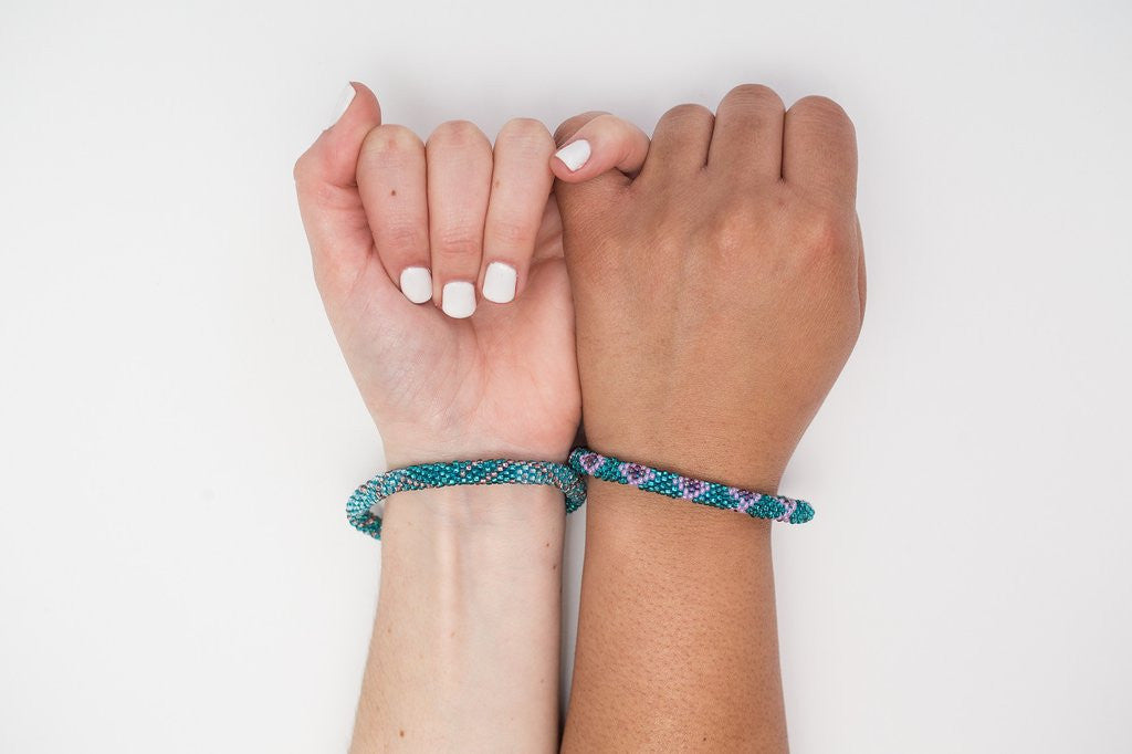 Aid Through Trade bracelets are hand-crafted beaded bracelets that roll on. Unique styling allows bracelet to roll over hand, instead of stretching. Handcrafted with high-quality glass beads, each piece is handmade with love by artisans in Nepal. Your purchase supports empowering women in Nepal by creating an opportunity for fair income and benefits through beautifully designed jewelry.