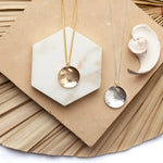 Our Bowen Necklace is the perfect necklace for every-day-wear. They are made by cutting the pendants to shape, applying a heavy hammered texture and then doming them for added shimmer & shine