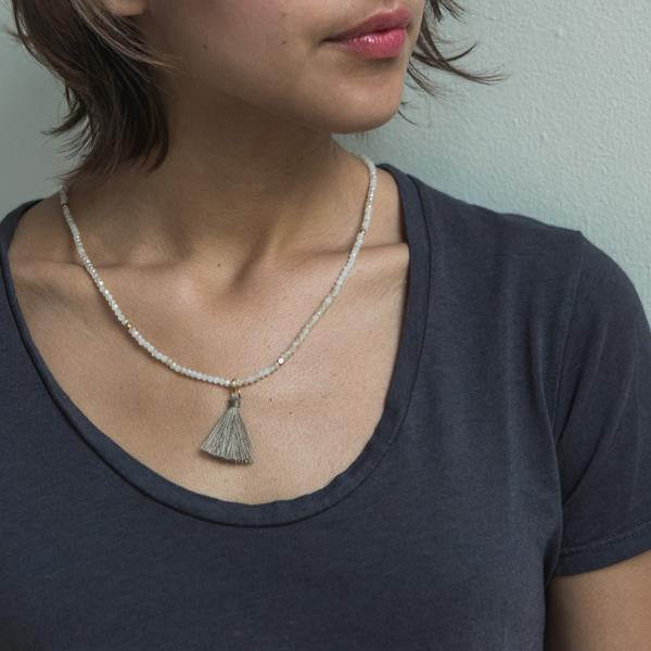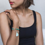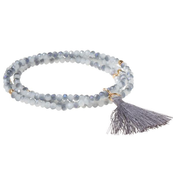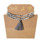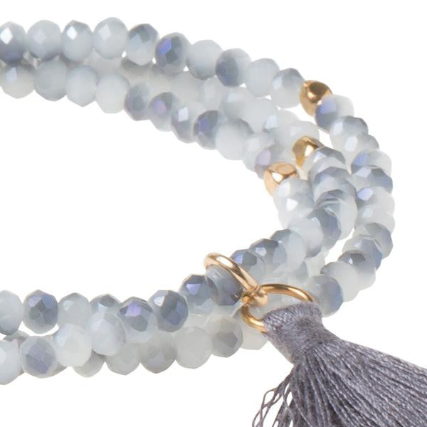 The Tassel Wrap is made with crystal beads strung with nuggets of gold and silver. It can be worn wrapped 3 times for a bracelet or wear as a single layer necklace. They look great stacked together or layered with the Scout Wrap.
