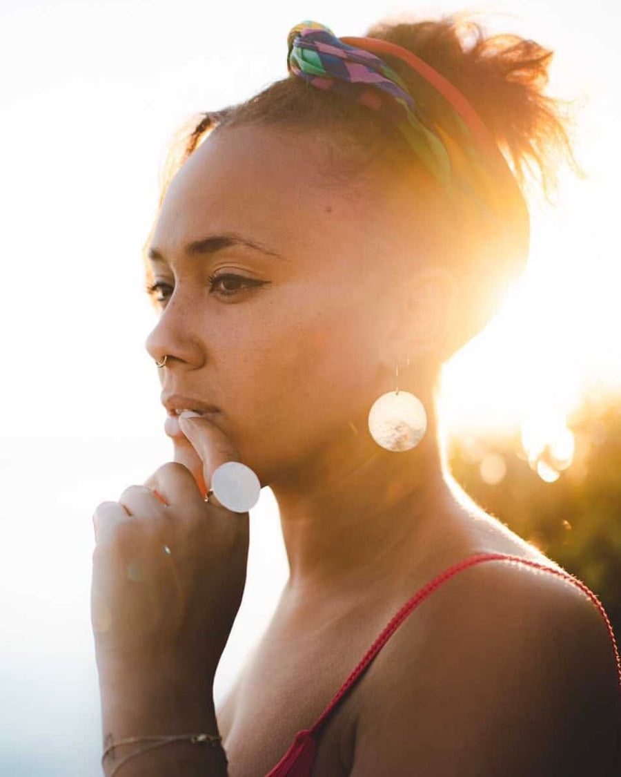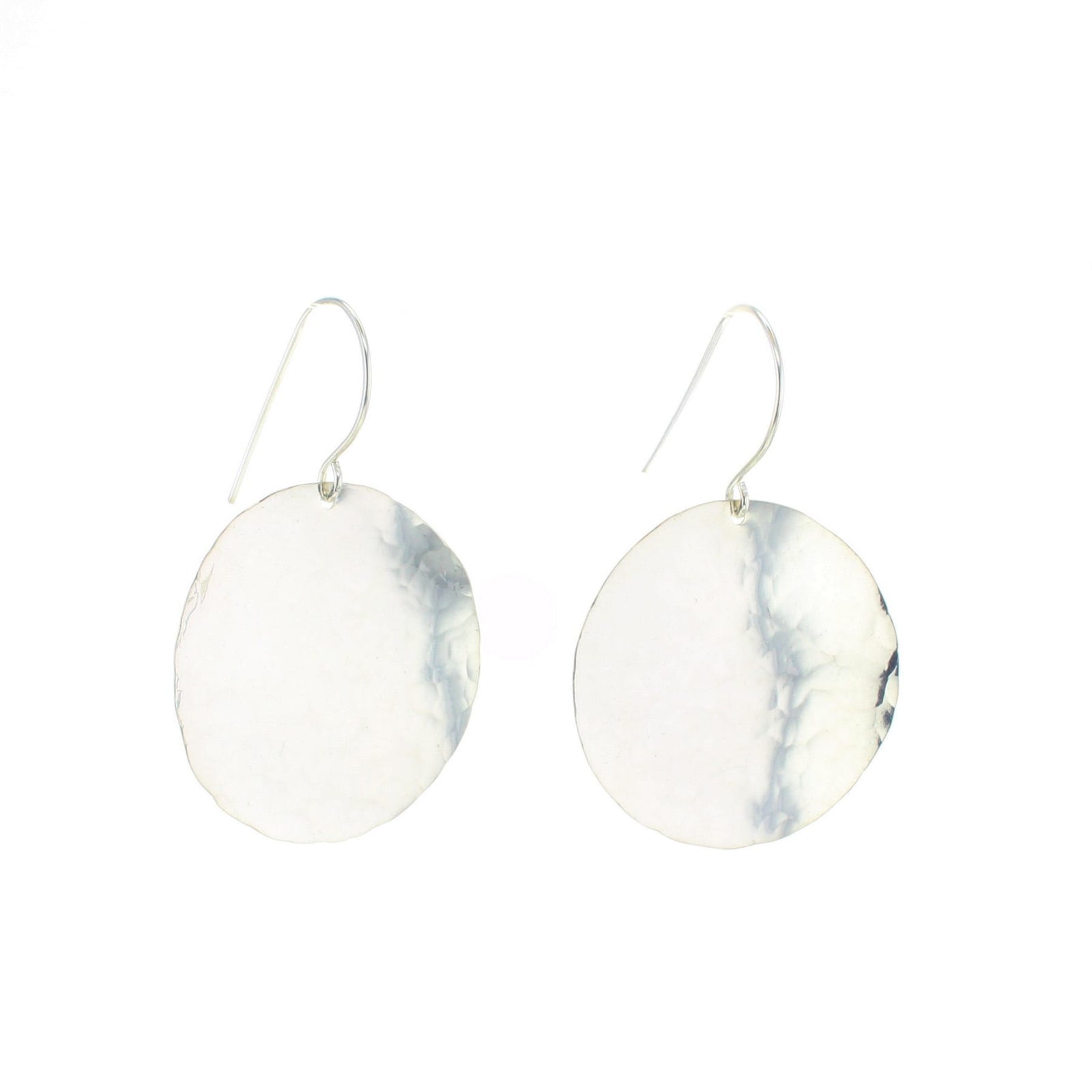 These statement earrings have a large 1.25" disc that is cut by hand and a shimmery hammered finish applied. They hang from a longer handmade ear wire, completing this stunning design.