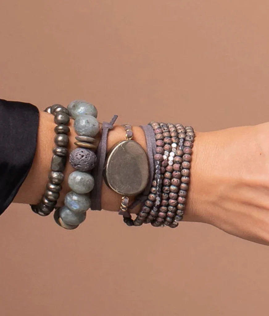 Soft buttery vegan suede and rich semi precious stones intertwine around your wrists or neckline. Effortlessly converts from bracelet to necklace.  Can be wrapped 3 times as a bracelet. Sliding magnetic clasp adjusts to wear as a necklace.