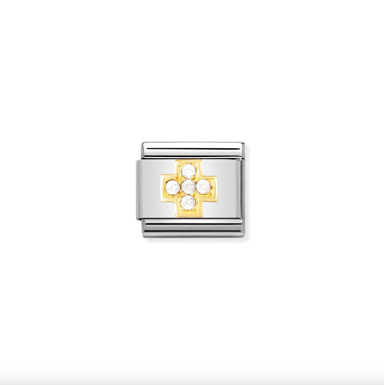 Original Charm for Nomination's Composable Classic Bracelet in stainless steel, bonded yellow gold and Cubic Zirconia with white Cross. Made in Italy. The perfect Charm to show your someone special that you care.