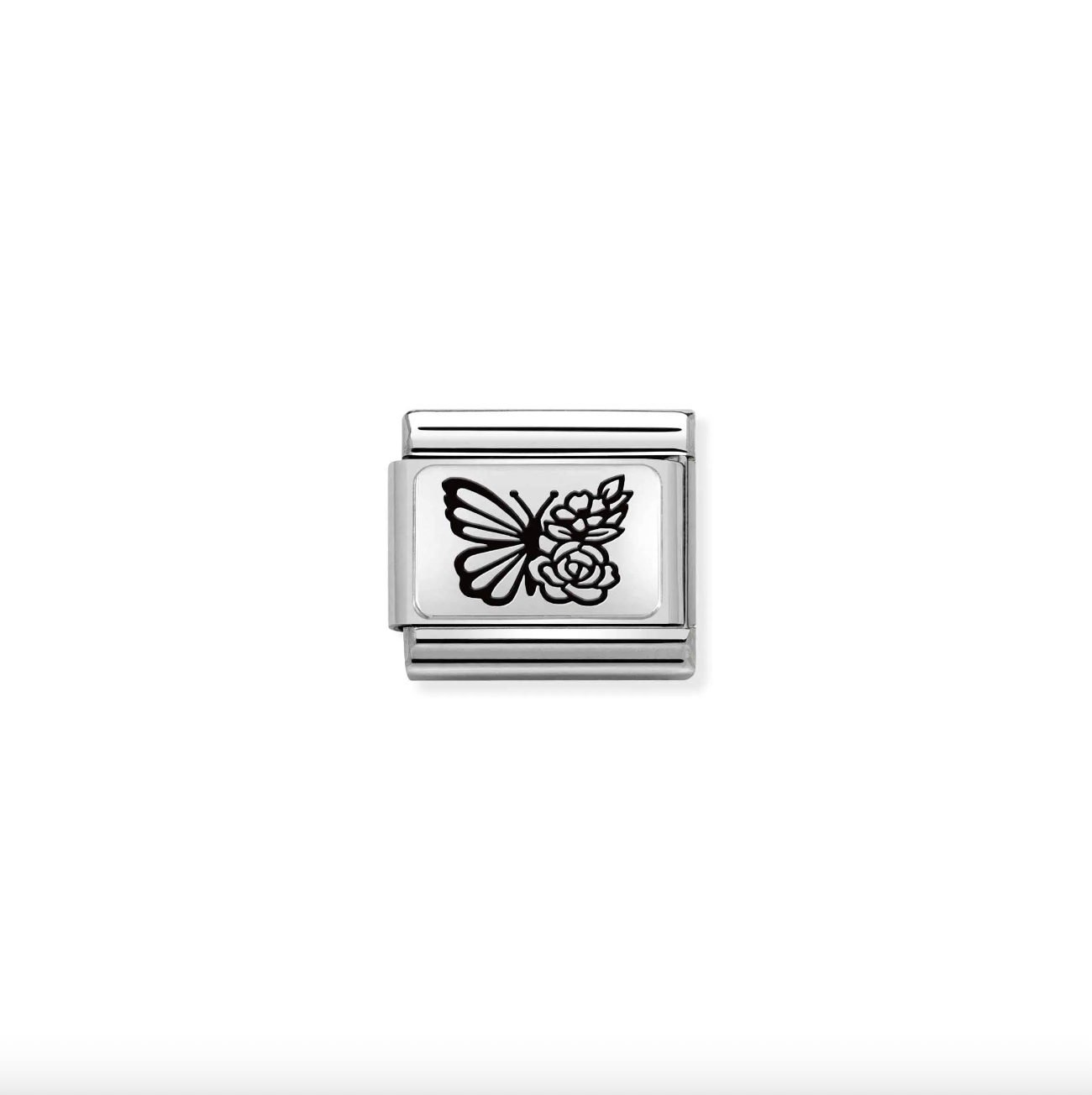 Original Nomination Link for Composable Classic Bracelets in stainless steel and sterling silver with Butterfly with flowers symbol in Black engraving. Made in Italy. The butterfly is the ultimate symbol of transformation; gift this Link to someone who has reached an important goal!