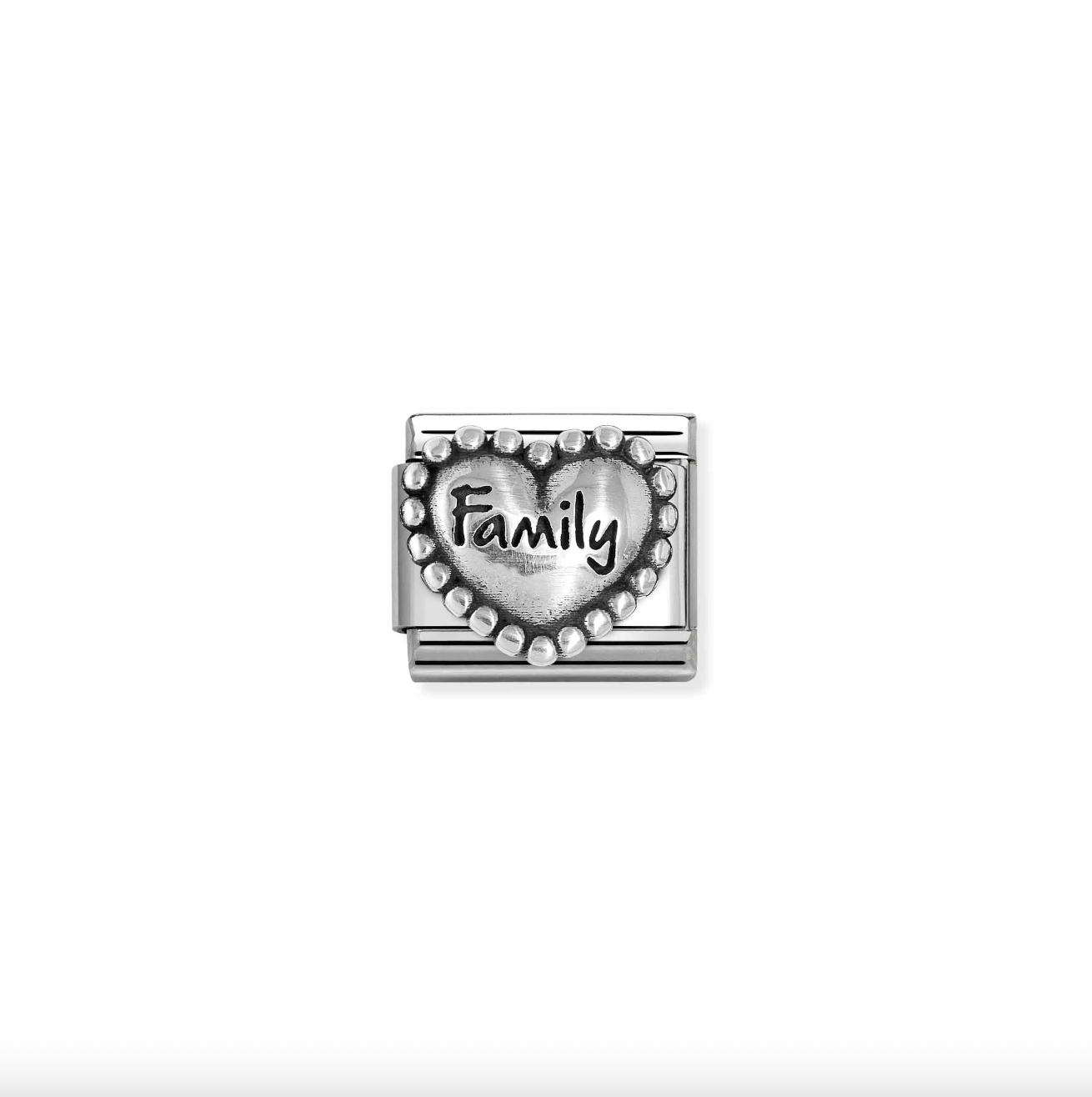Original Nomination Composable Classic Link for Composable bracelet in stainless steel with sterling silver decorated Heart symbol with FAMILY engraving. A Link to choose for the whole family! This Composable Classic Link with a delicate and refined heart is the perfect way to remind someone they are special with style.