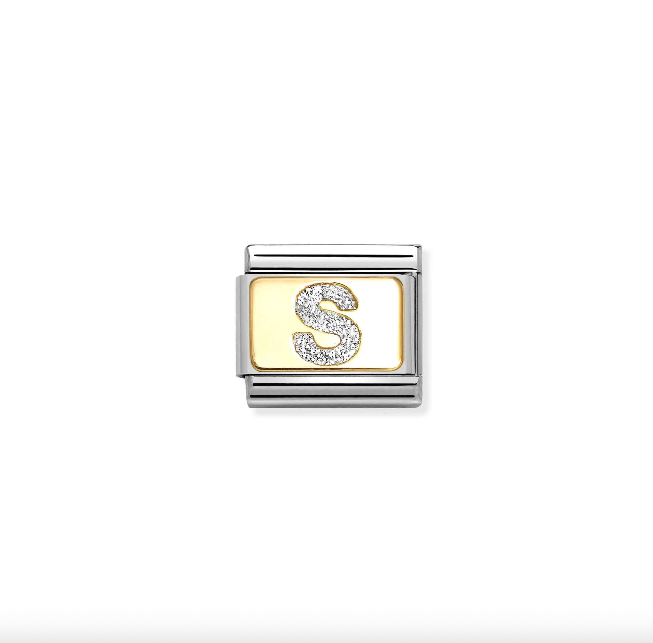Original Nomination Classic Link in stainless steel and yellow gold with Letter “S” symbol with Silver Glitter. Made in Italy. Make your bracelet one-of-a-kind by adding your initial or your name to it.