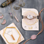 - Presented on recycled linen cards that tell the meaning of each stone: