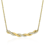 Simple, but yet a classic beauty!!! This diamond and gold twisted necklace is all you need on your neck. Wear it alone or layered with your favorite jewelry to show off the round diamonds with a shared prong setting. The chain holding this together is a 14k White Gold 1.2 mm cable chain tightly secured with a lobster clasp.