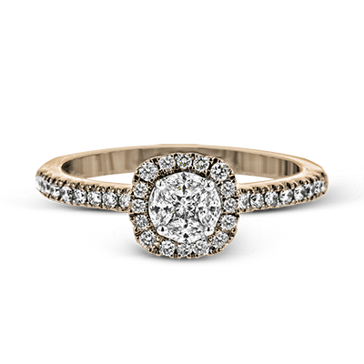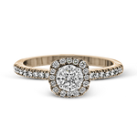 This Zeghani Engagement Ring features a beautiful round diamond halo surrounding a stunning princess and marquis diamonds set in 14k rose gold. It's a timeless ring with lots of sparkle.