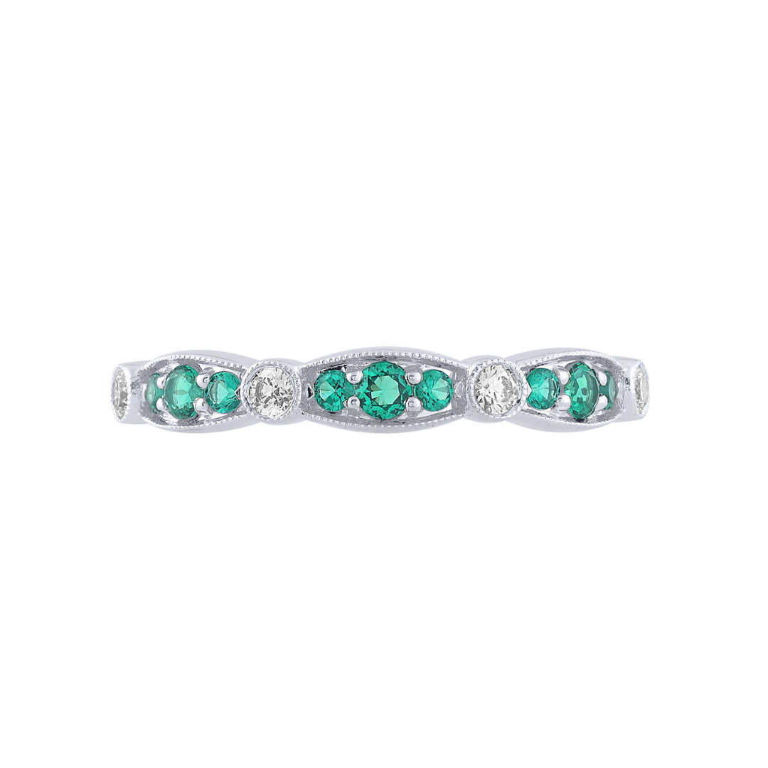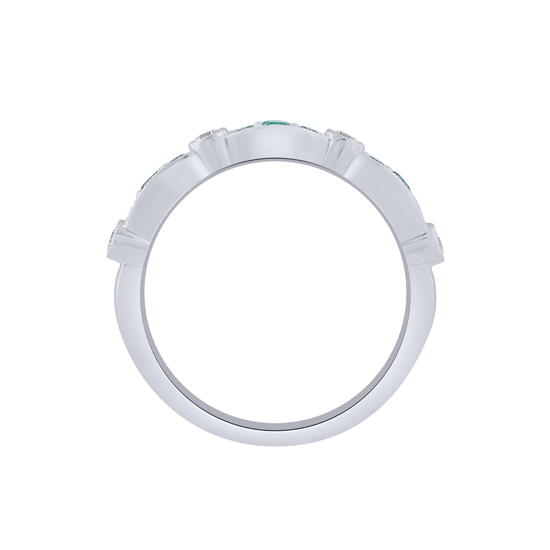 Add a touch of vibrant elegance to your collection with this stunning emerald and .13ct diamond band. Designed with alternating round diamonds and vivid green emeralds, this ring offers a beautiful balance of color and sparkle. Each gemstone is set in a milgrain-accented white gold band, giving the piece a refined, vintage-inspired charm.