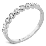 This elegant Zeghani band showcases round brilliant diamonds set in individual bezel settings, offering a clean and modern look with vintage flair. Crafted in polished white gold, it's ideal as a stacking ring, wedding band, or minimalist statement piece with a refined sparkle.