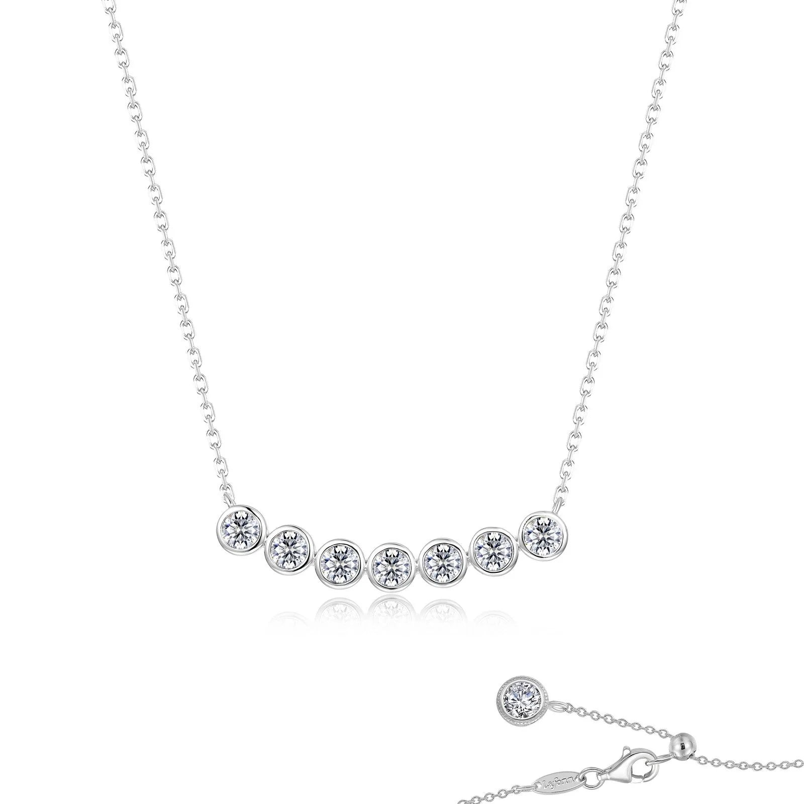 Seven symbols, one radiant statement. Part of our 7 Symbols of Joy Collection, the Bezels of Joy Necklace showcases seven stones, each representing Longevity, Health, Love, Happiness, Peace, Prosperity, & Friendship. A modern and meaningful piece that is perfect for layering or wearing solo. Set with Lafonn's signature Lassaire simulated diamonds in sterling silver plated with gold.