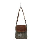 This By-cycle print shoulder bag is crafted from quality with a combination canvas & leather. It have a premium leather flap-over and a zipper pocket at the backside.