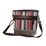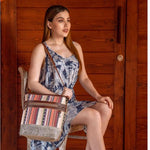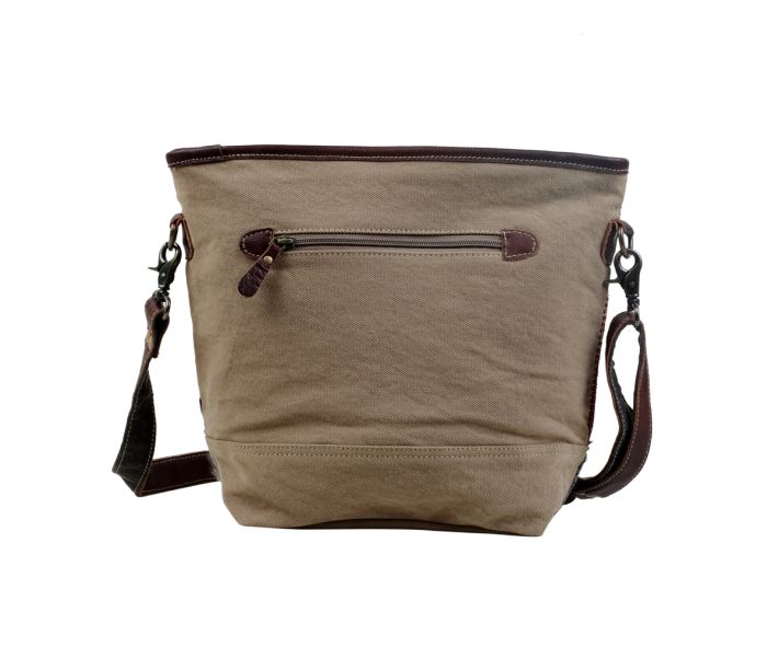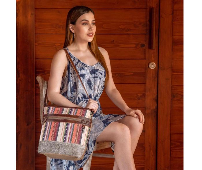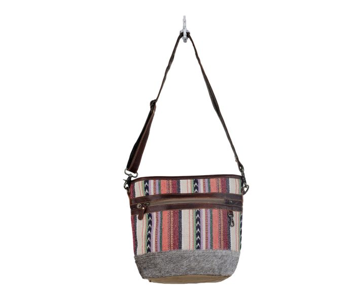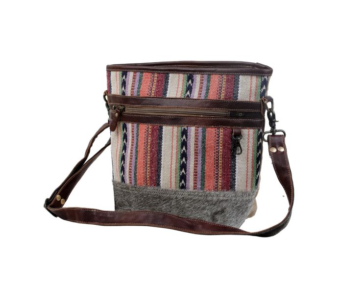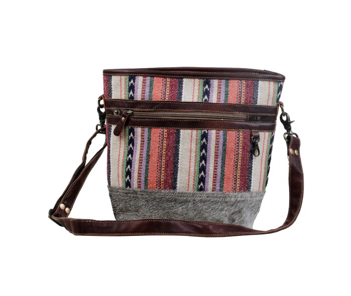 This shoulder bag has bands of pattern interlaced to form a piece with an artistic vibe. The grey cowhide portion used at the bottom gives it a sturdy base.