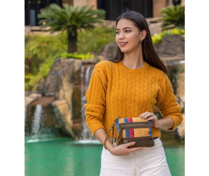 This vibrant purse will go really well with a summer dress. It also has a front zipper that can hold little trinkets and a ring at the left corner for an easy grip.