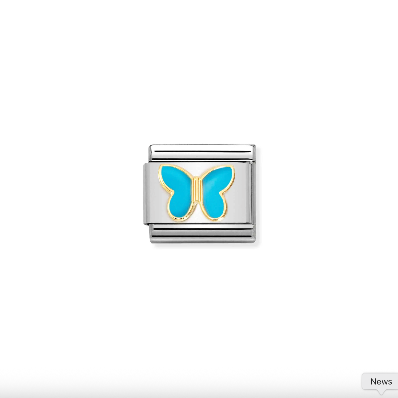 Original Nomination Classic Link in stainless steel and yellow gold with Butterfly symbol with Turquoise enamel. Made in Italy. The Butterfly Link is the perfect gift for the Nature lover - choose your favourite colour.