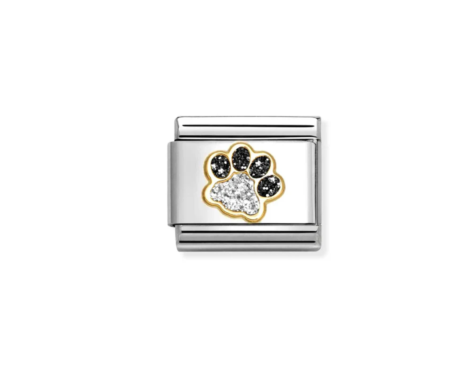 Original Nomination Classic Link in stainless steel and yellow gold with Paw Print symbol with Silver Glitter. Made in Italy. This Link looks great as a single add-on or in pairs on to any bracelet.