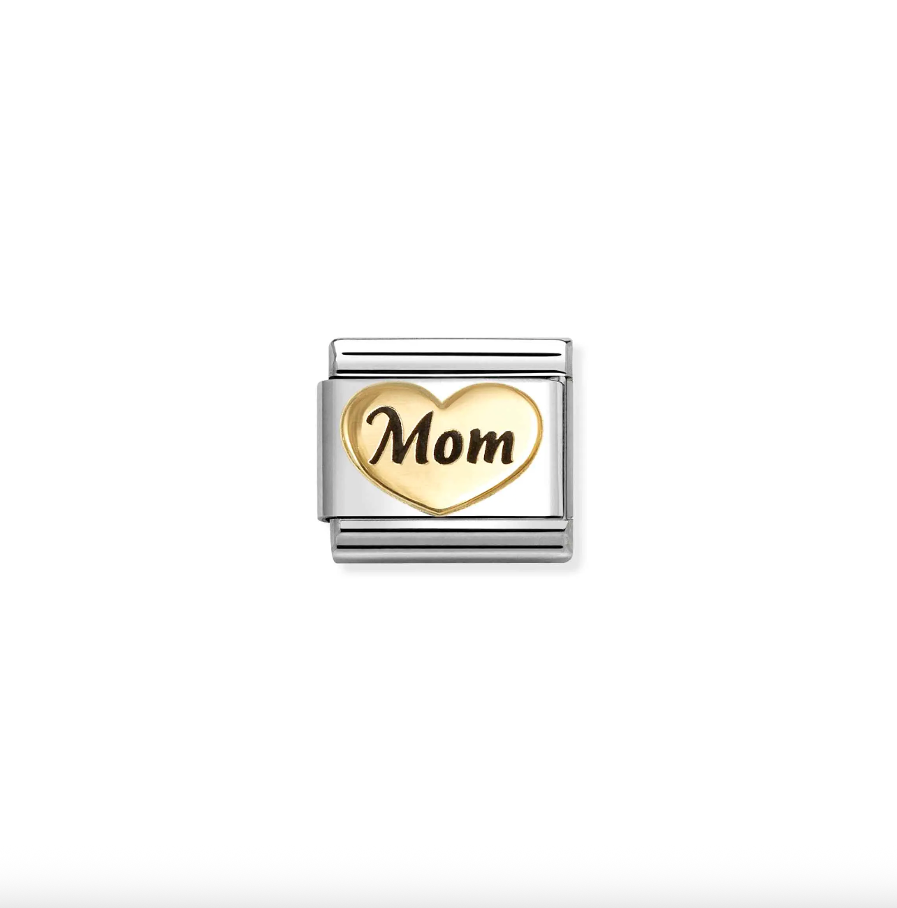Original Nomination Composable Classic Link for Composable bracelet in stainless steel with Heart shaped yellow gold symbol with MOM in Black Enamel. The perfect way to show Mom how you feel about her.