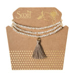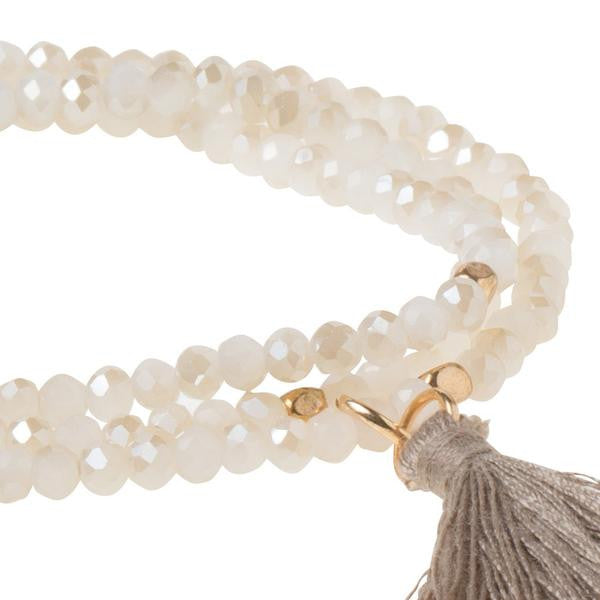 The Tassel Wrap is made with crystal beads strung with nuggets of gold and silver. It can be worn wrapped 3 times for a bracelet or wear as a single layer necklace. They look great stacked together or layered with the Scout Wrap.